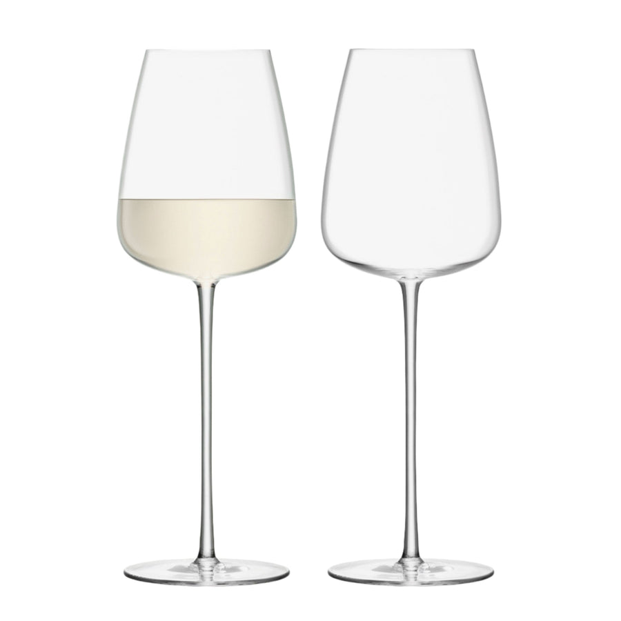 A set of two modern wine glasses with generous, flat-based bowls. Expert craftsmanship is required to mouth blow the fine bowls, draw the stems and apply the feet by hand.